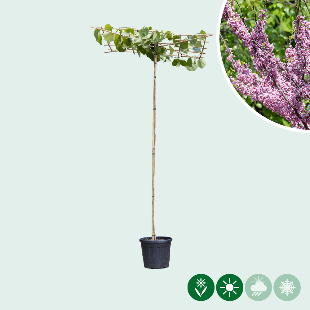 De judasboom Lavender Twist als dakboom heeft een stamhoogte van 200 – 220 cm en een vierkant dak van 120 x 120 cm.