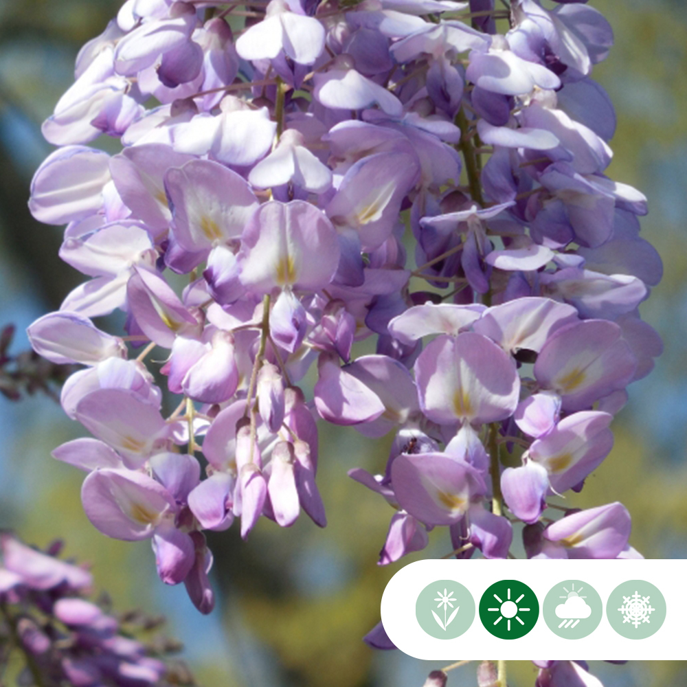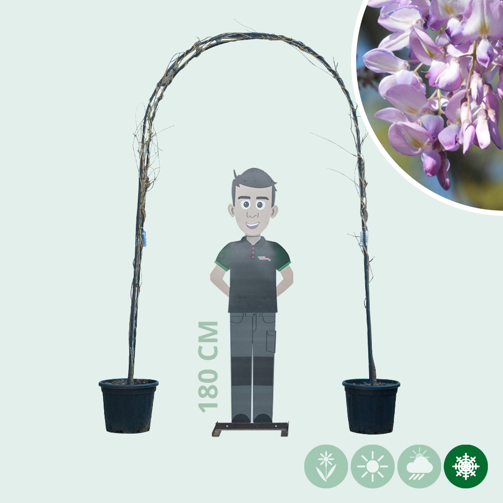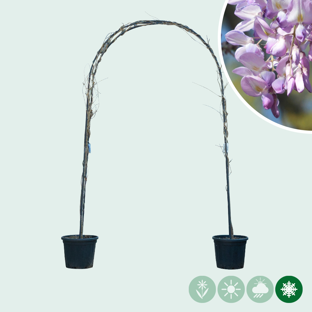 De blauweregen groeit het beste op een zonnige plek en houdt van goed doorlatende grond. Door de plant jaarlijks te snoeien, blijft de boog mooi in vorm en stimuleer je een rijke bloei in het volgende seizoen.