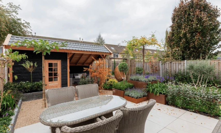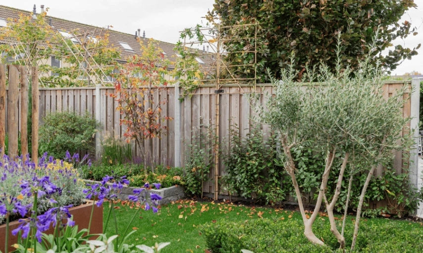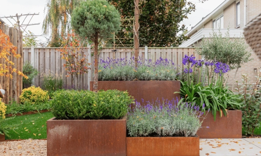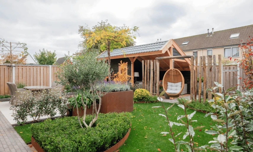 Ivo combineerde strakkere lijnen met natuurlijke materialen, waardoor de tuin ruimtelijk blijft maar toch warm oogt. De beplanting bestaat uit sfeervol groen, sterke soorten en een paar mooie accenten voor kleur en hoogte. Door het gebruik van natuurlijke tinten zoals roestkleurige plantenbakken krijgt de tuin een rustige uitstraling die goed past bij Annemieke en haar zoons.