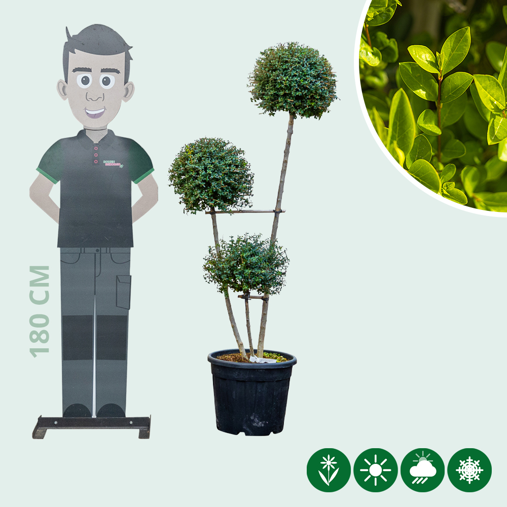 De bol liguster pompom is een compacte en sierlijke bolboom die perfect past in moderne en klassieke tuinen. De Ligustrum delavayanum staat bekend om zijn dichte, fijnvertakte groei en het kleine glanzende blad dat het hele jaar door groen blijft. Door de plant te snoeien in een ronde vorm ontstaat een speelse pompombol die direct opvalt. Deze vorm maakt de bol liguster ideaal voor in een border, voortuin, patio of bij een entree.