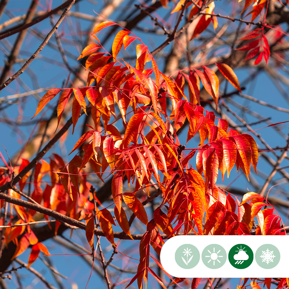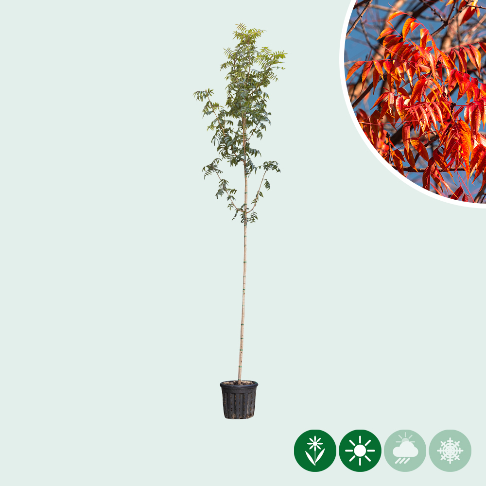 Met de Pistacia chinensis haal je een opvallende hoogstam in huis die van april tot laat in de herfst een indrukwekkende uitstraling heeft.