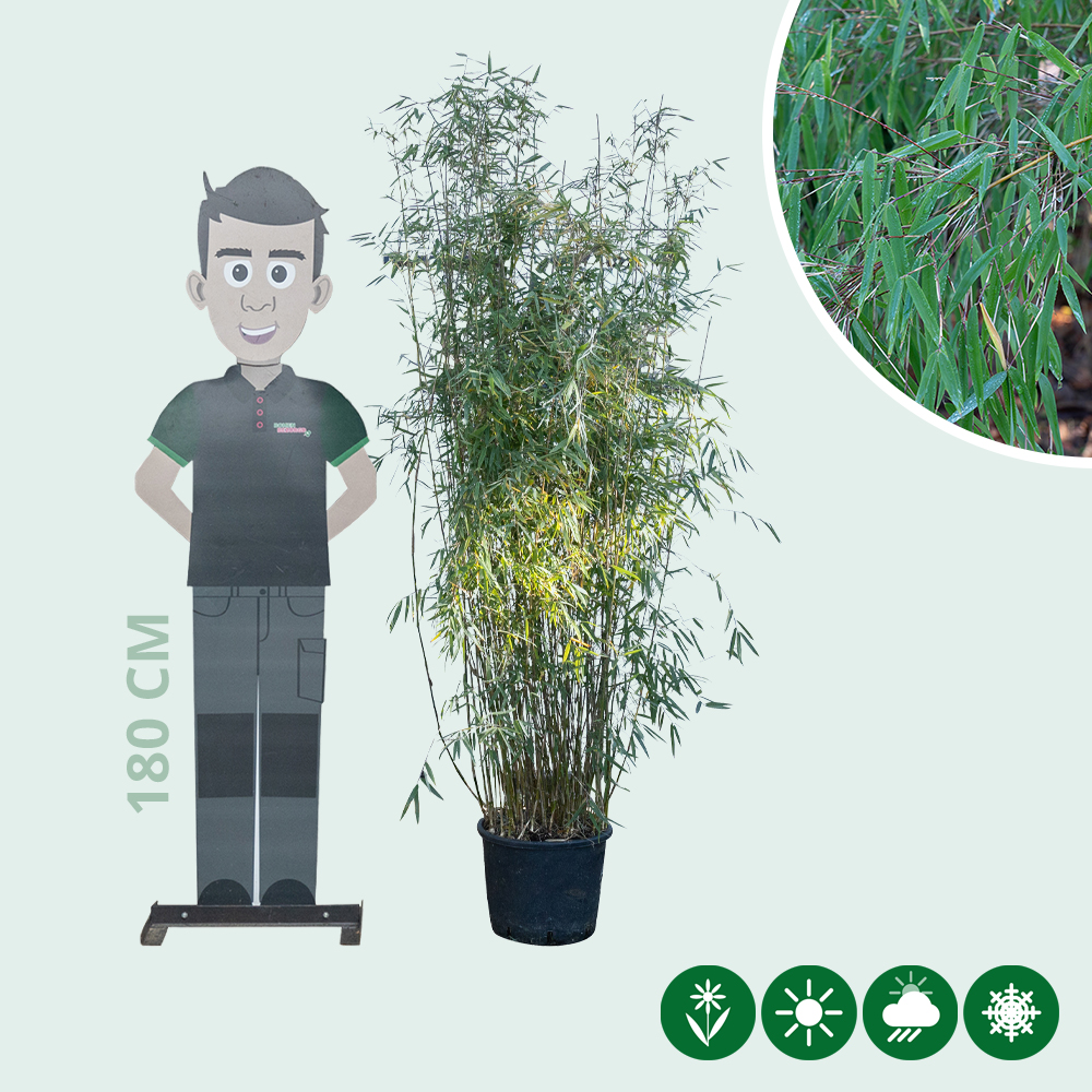 De niet woekerende bamboe Fargesia Jiuzhaigou heeft een totaalhoogte van 150 tot 175 centimeter.
