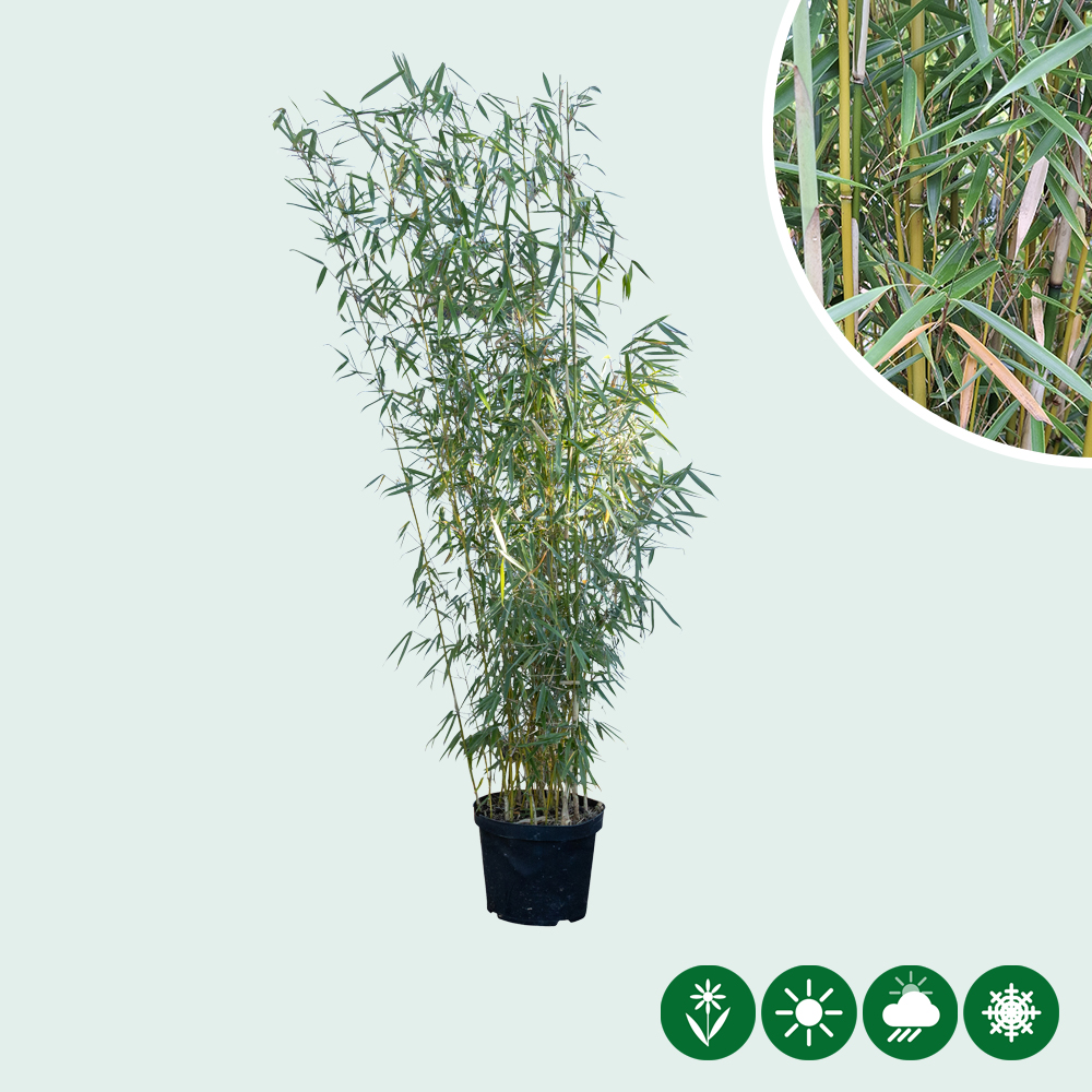 De Fargesia robusta ‘Campbell’ is een sterke, niet woekerende bamboe met een frisse en moderne uitstraling. Deze soort valt op door zijn stevige halmen en het mooie contrast tussen de donkergroene bladeren en de lichte scheutomhulsels. De plant groeit rechtop en blijft hele jaar door groen. Door zijn rustige groei en dichte bladstructuur is dit een uitstekende keuze voor een groene haag, als privacyplant of als solitair in de tuin.