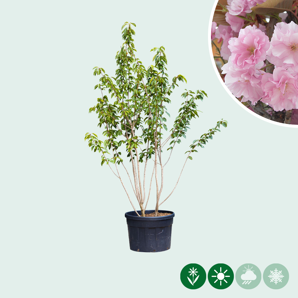 De Japanse sierkers meerstammig is een geliefde boom die vooral in het voorjaar schittert. Grote trossen roze bloemen verschijnen en zorgen voor een prachtig kleurrijk beeld. Het blad van de Prunus serrulata Kanzan is eirond en heeft bij het uitlopen een bronsgroene tint.