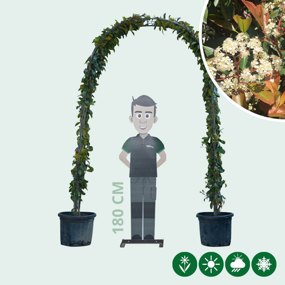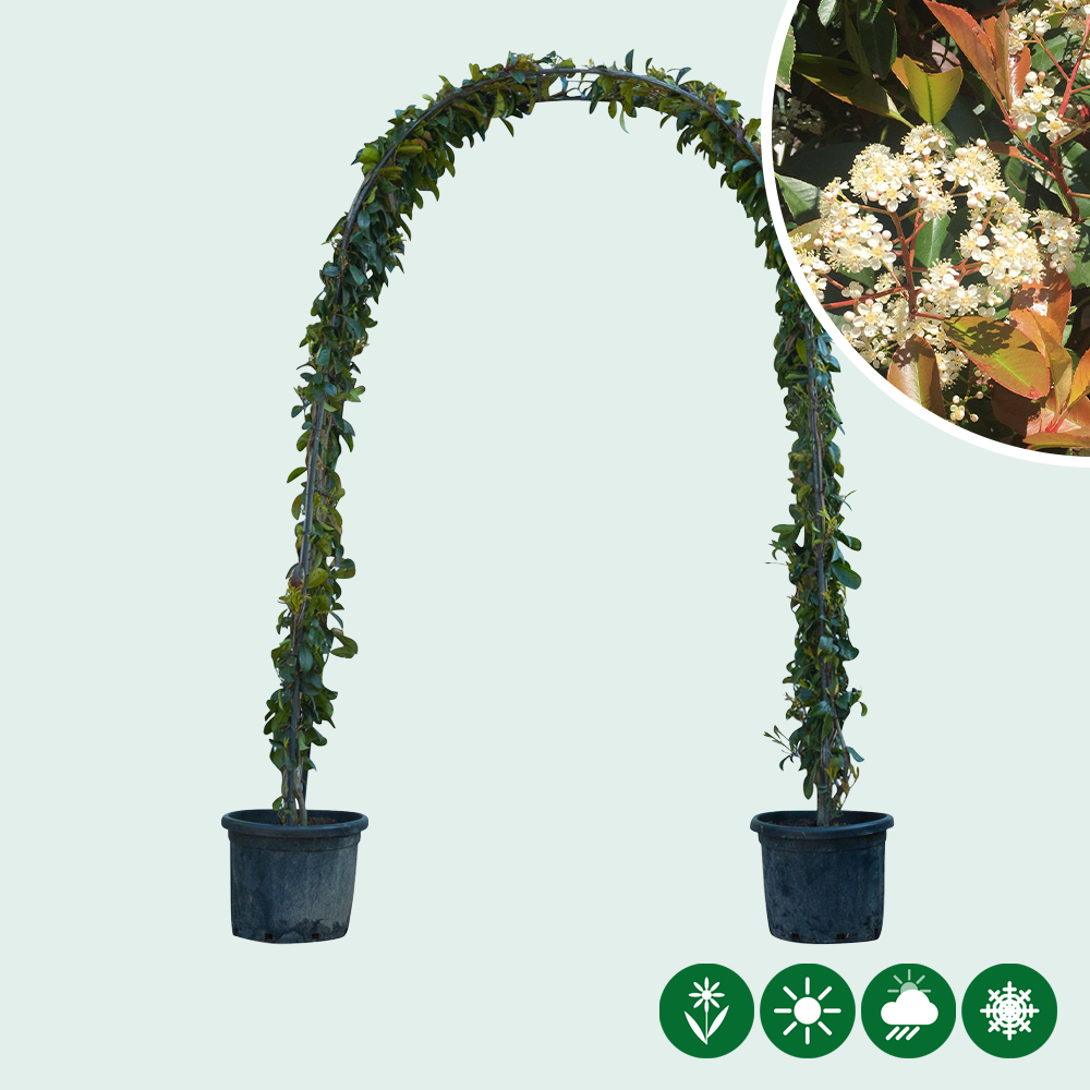 In het voorjaar loopt het blad van de glansmispel opvallend rood uit, wat zorgt voor een mooi kleurcontrast met het oudere, donkergroene blad. In mei en juni verschijnen daarnaast sierlijke witte bloemen die de boog een frisse uitstraling geven. Met een glansmispel boog voeg je niet alleen groen toe, maar ook kleur en structuur aan de tuin.