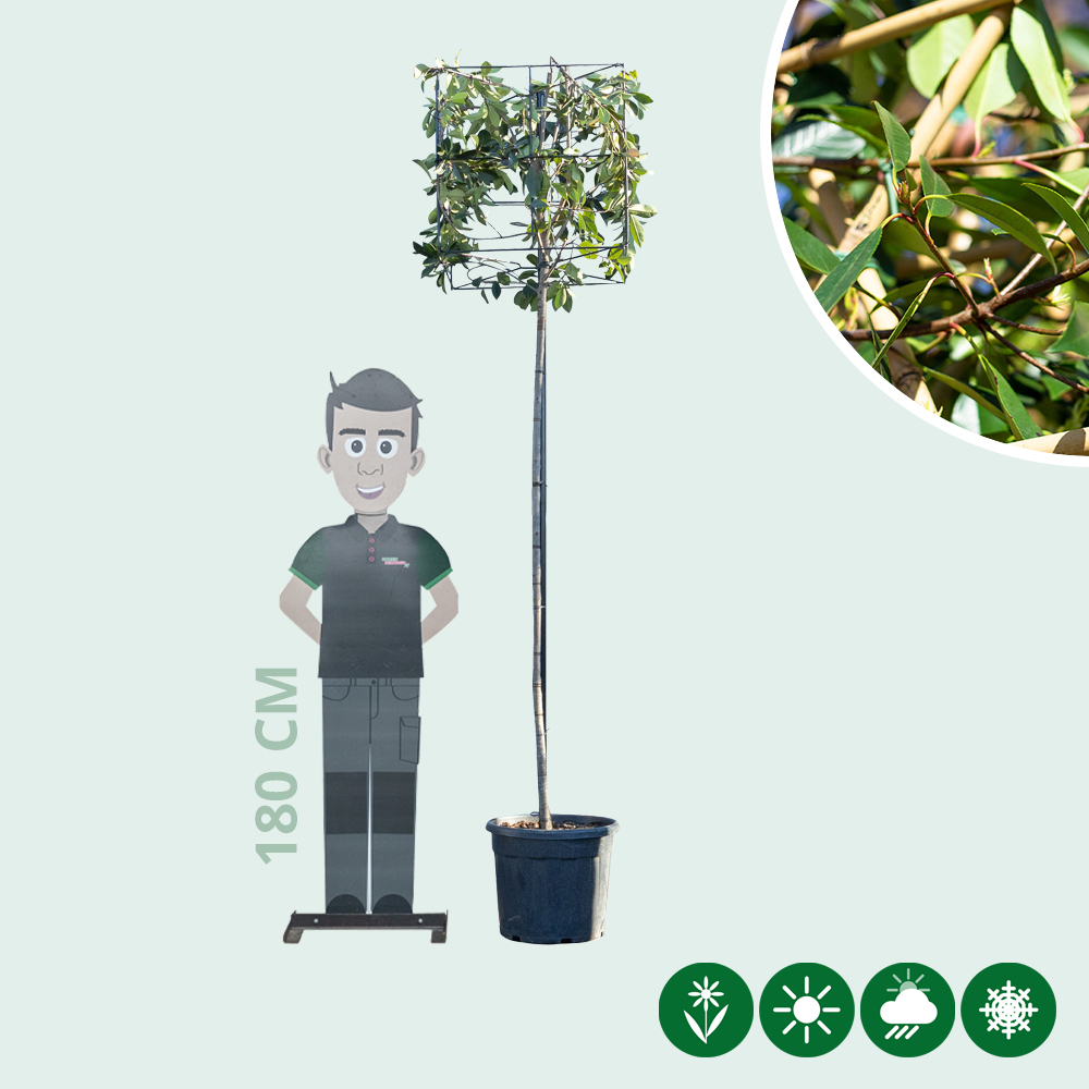 De glansmispel kubusvorm heeft een stamomtrek van 6 tot 10 centimeter en een totaalhoogte van 300 tot 320 cm.