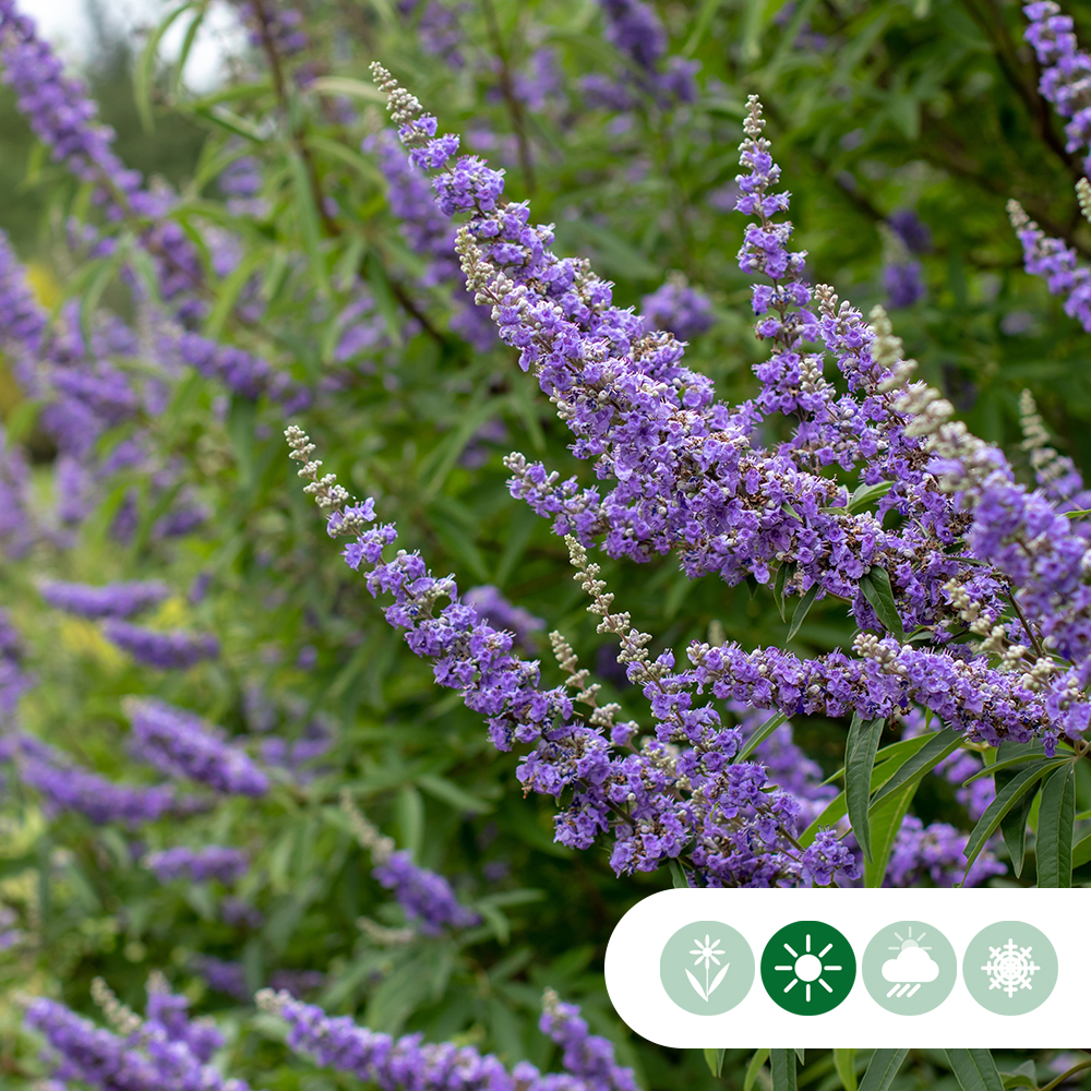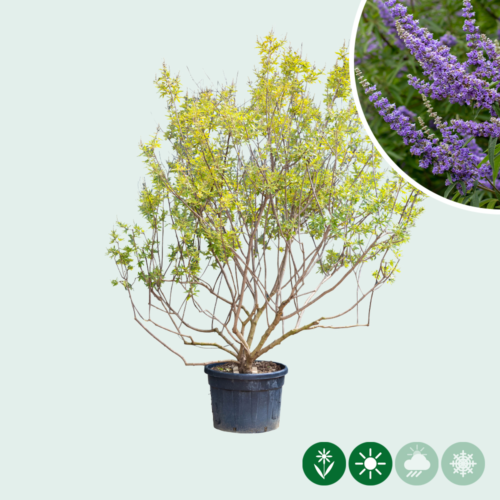 De Kuisheidsboom in meerstammige vorm, bekend als Vitex agnus-castus, is een sierlijke meerstammige boom die vooral in de zomer opvalt. Van juli tot september verschijnen lange opstaande bloeiaren met lilablauwe bloemen die veel bijen en vlinders aantrekken. De bloei geeft de plant een mediterrane uitstraling die perfect past in zonnige tuinen.