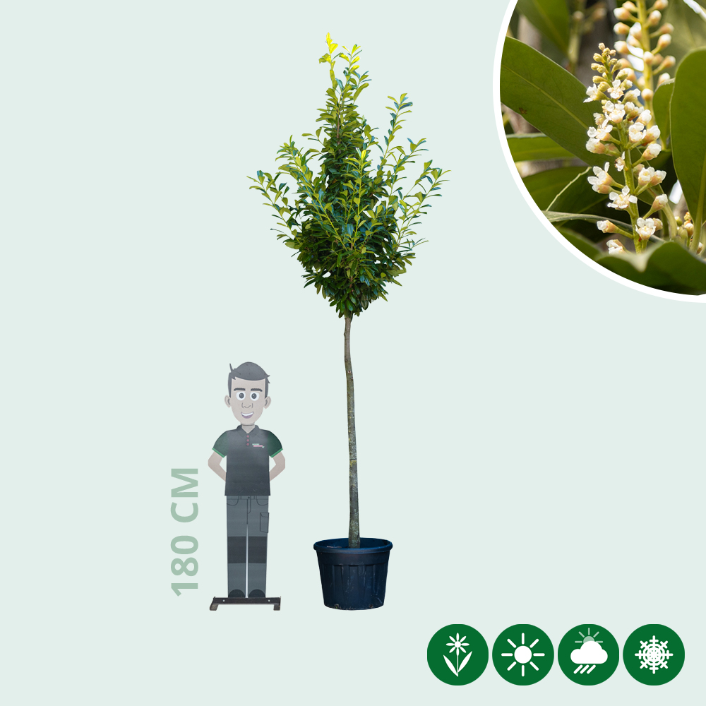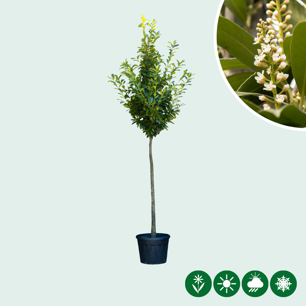 De laurierkers hoogstam is een groenblijvende boom. Het blad van de laurierkers is groen en lancetvormig. In mei bloeien er op deze hoogstam prachtige witte bloemen in trossen.