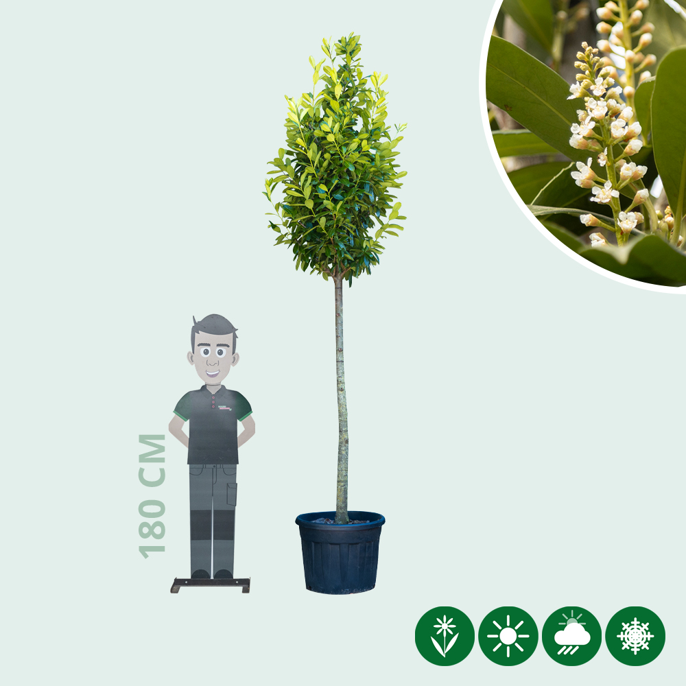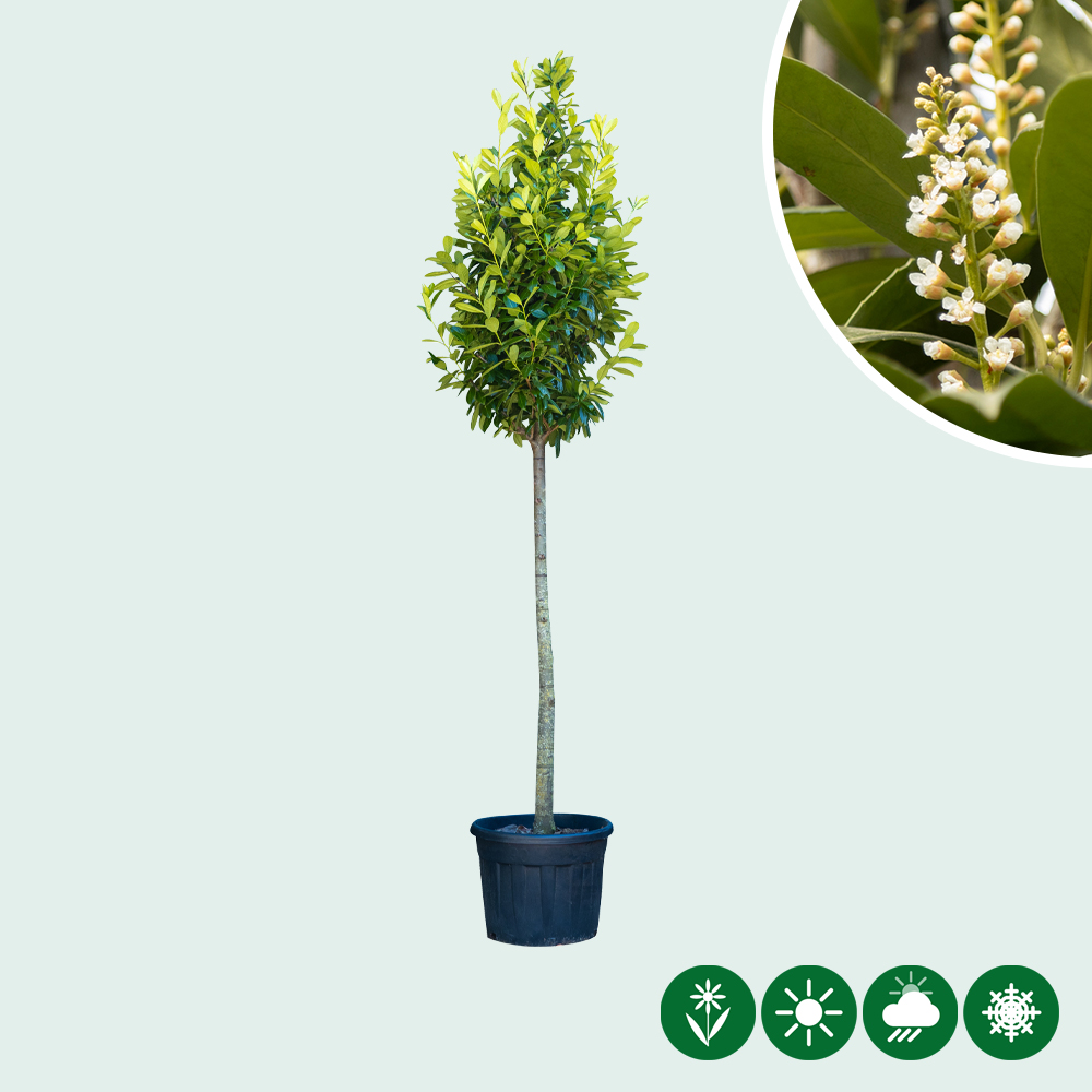De laurierkers hoogstam is een groenblijvende boom. Het blad van de laurierkers is groen en lancetvormig. In mei bloeien er op deze hoogstam prachtige witte bloemen in trossen.