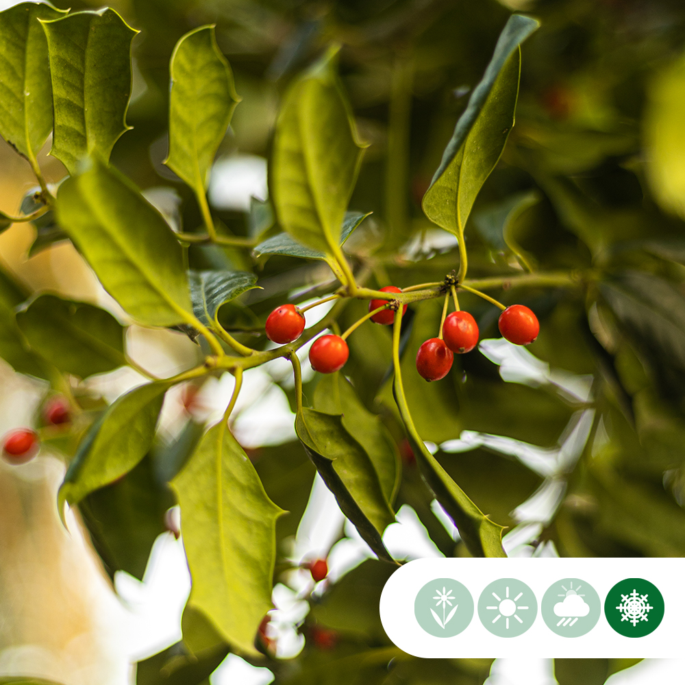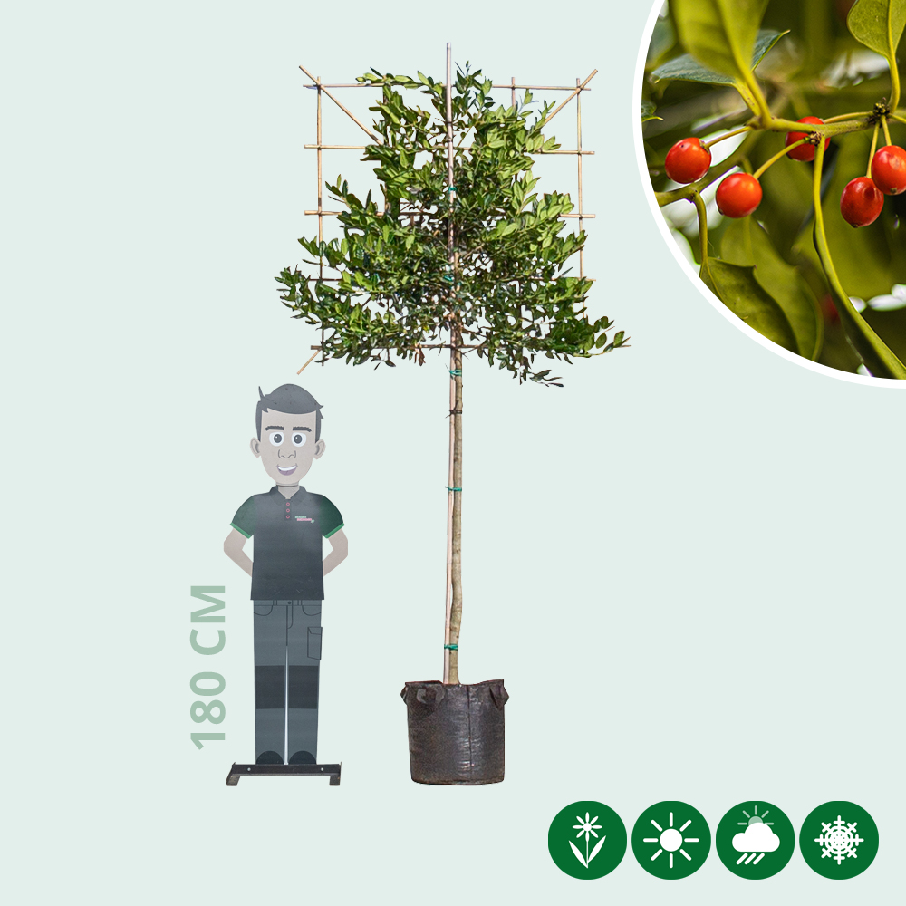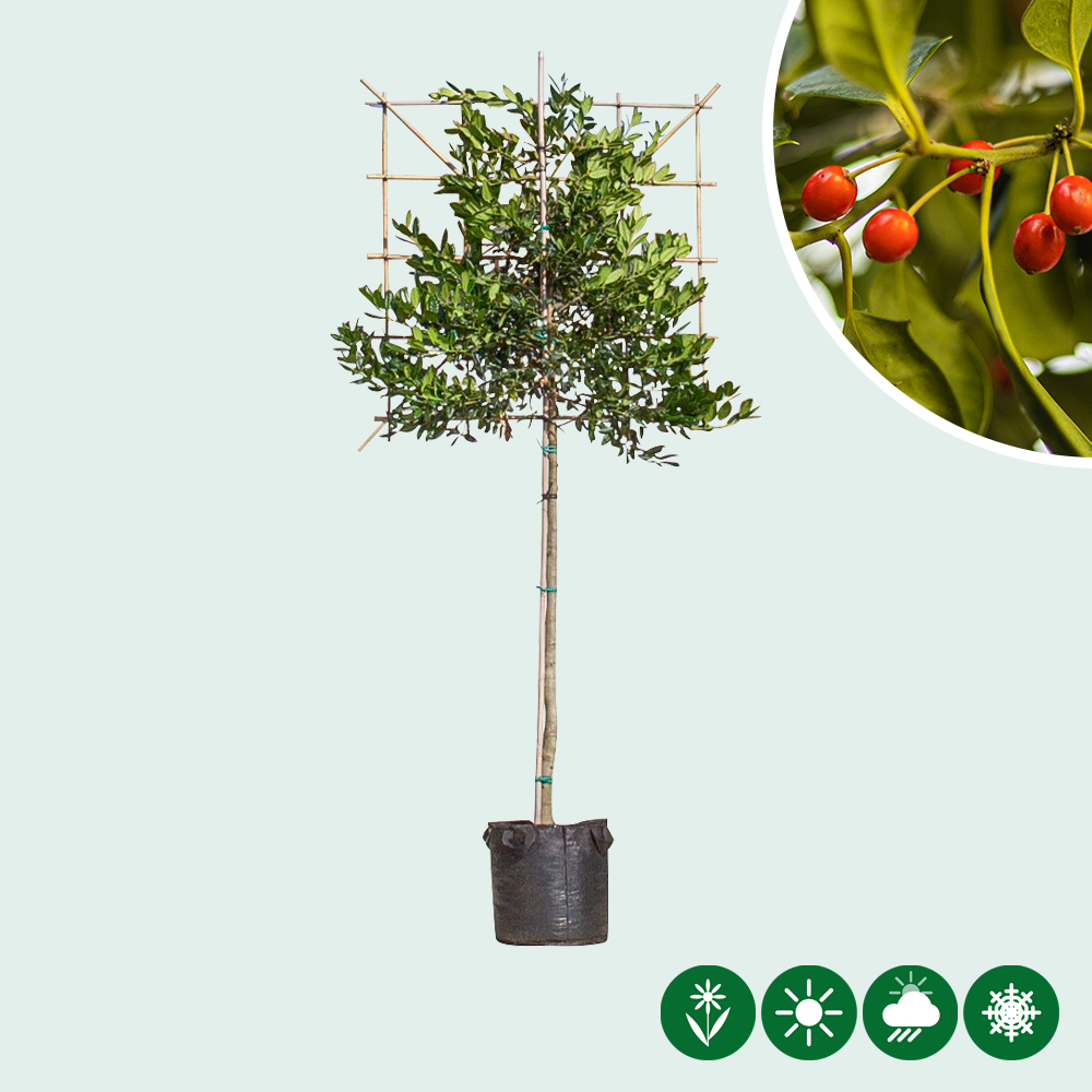 De leihulst is een groenblijvende leiboom die het hele jaar door veel privacy kan bieden in uw tuin. Deze groenblijvende leiboom, ook wel Ilex Nellie Stevens genoemd, heeft prachtig glanzend en getand blad en is donkergroen van kleur. De hulst is een aanrader wanneer u op zoek bent naar een boom die privacy biedt. De hulst heeft namelijk een dichte kroonstructuur en kan daardoor inkijk van bijvoorbeeld buren voorkomen. Doordat de hulst als leiboom bladhoudend en tevens groenblijvend is, biedt de boom ook in de winter privacy. Daarnaast is deze boom ook nog eens zeer winterhard en kan kortstondige temperaturen tot -23 graden Celsius verdragen. Het is dus een zeer sterke boom en hij is zo goed als vrij van ziektes. De Ilex Nellie Stevens is zeer onderhoudsvriendelijk en hoeft maar 1 keer per jaar gesnoeid te worden. Snoei de hulst als leiboom in het voorjaar terug tot een egaal gelijkend scherm. Het mooiste is om de hulst te snoeien met een sterke heggenschaar.