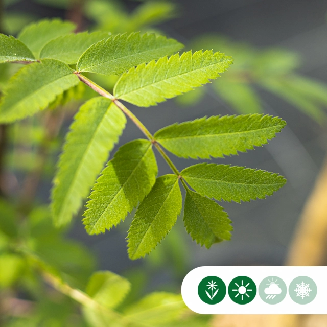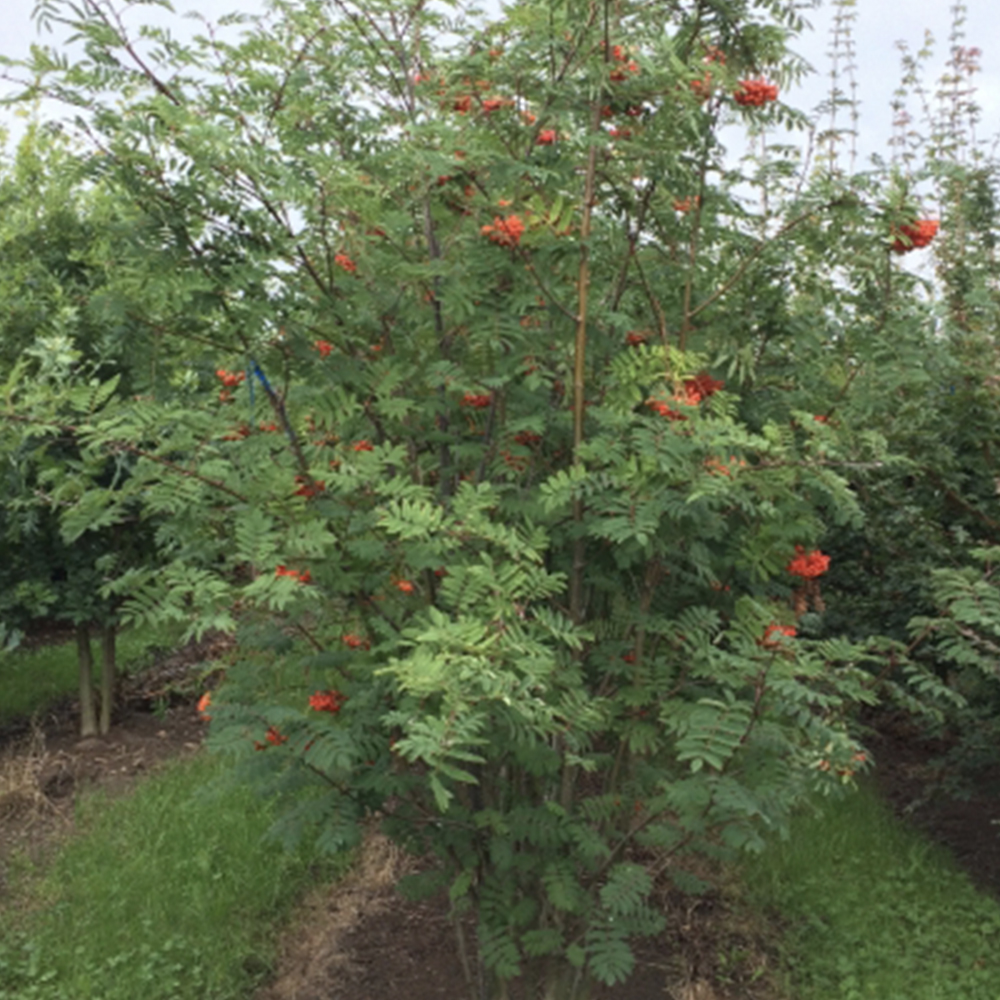 De lijsterbes meerstammig (Sorbus aucuparia) is een zeer winterharde boom. Deze meerstammige boom heeft een dichte kroonstructuur. Het blad van de Sorbus aucuparia is donkergroen, ovaal, geveerd en voelt leerachtig aan.