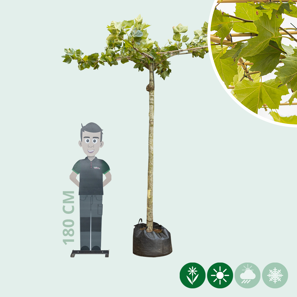 Deze volgroeide dakplataan heeft een stamhoogte van 220 centimeter. Hij heeft een stamomtrek van 20 tot 25 centimeter. Door de dakplataan jaarlijks te snoeien is het goed mogelijk de boom op deze hoogte te houden. Snoei de boom als een mooi egaal dak en geniet zo elk jaar weer van je eigen stukje schaduw in jouw tuin.