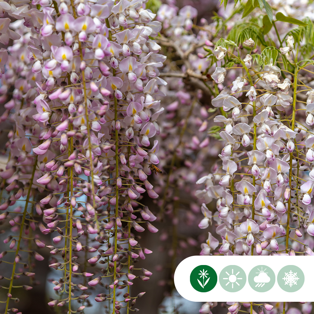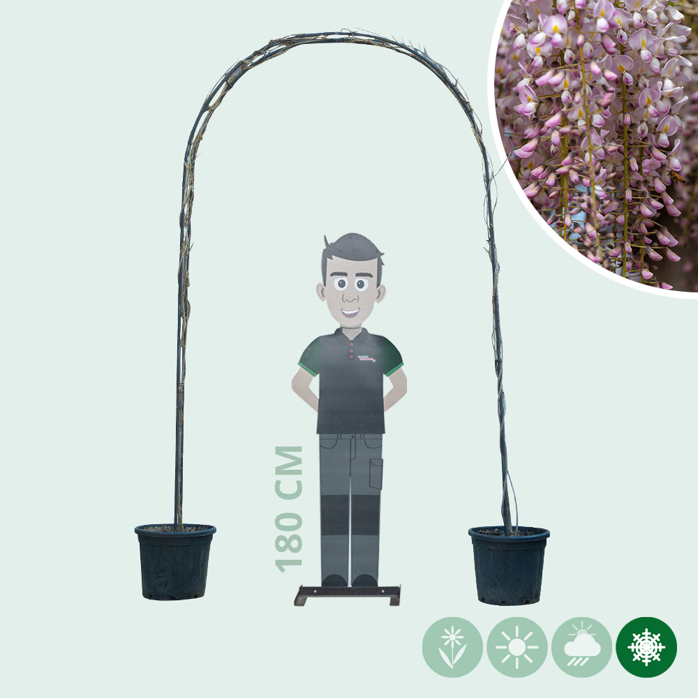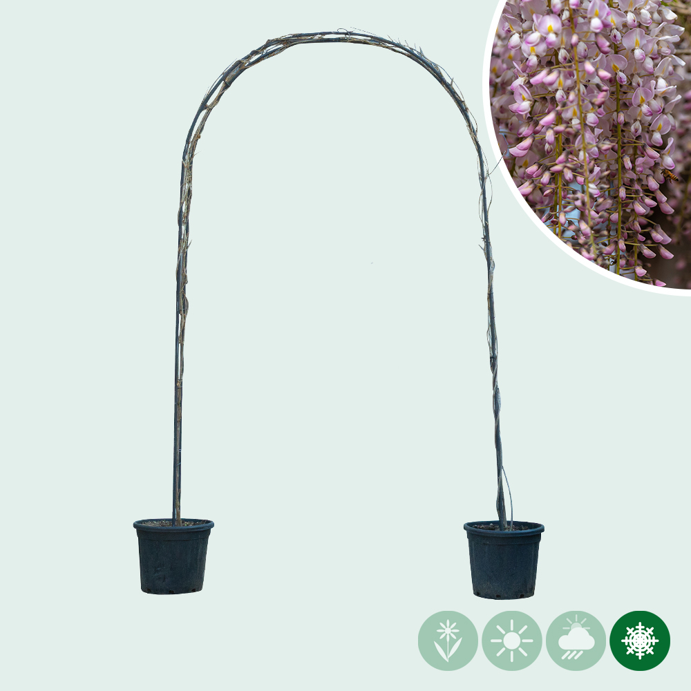 De roze regen als boog is een sfeervolle keuze voor de tuin en geeft direct een zachte, romantische uitstraling. Waar de Wisteria normaal tegen een pergola of gevel groeit, vormt deze klimplant langs een boog een elegante doorgang vol groen en bloei. In het voorjaar verschijnen lange, hangende bloemtrossen in zachtroze tinten die een aangename geur verspreiden en zorgen voor een bijzonder geheel.