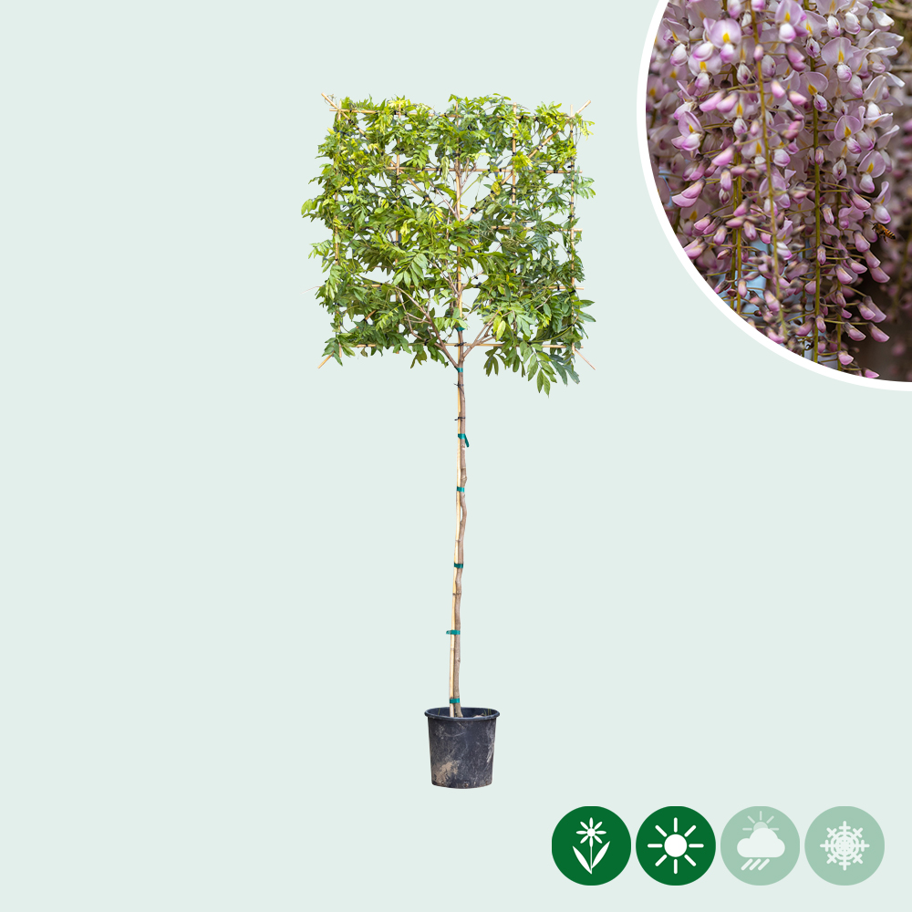De Wisteria sinensis ‘Rosea’ als leiboom is een bladverliezende klimplant die langs een rek wordt geleid. In mei verschijnen lange trossen zachtroze bloemen met een aangename geur. Soms volgt in september een tweede bloei. De roze regen is een krachtige groeier, waardoor het leirek snel mooi vol staat. Dankzij de leivorm is deze plant ideaal voor langs een schutting of gevel en geeft hij de tuin een romantische en sierlijke uitstraling.