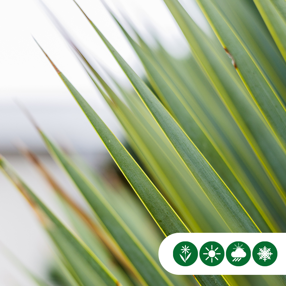 Deze palmlelie valt op vanwege de opvallende lichtbruine stam. Daarnaast heeft deze palm een prachtige kroonstructuur met honderden langwerpige blauw/grijze bladeren. Hoe ouder en hoe groter de palmlelie wordt, des te meer hij de show steelt met zijn schoonheid.